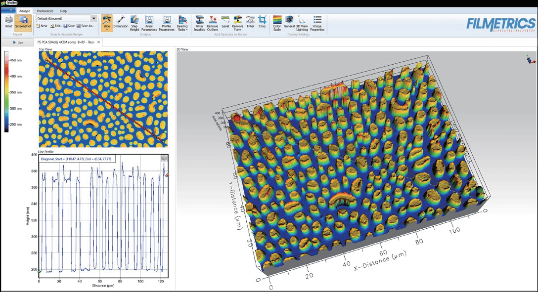 • ?測量簡單:?Profilm3D光學(xué)輪廓儀軟件能直觀的反應(yīng)包括表面粗糙度,形狀和臺(tái)階高度的測量。在數(shù)秒內(nèi),您可以獲得平面和曲面表面上測量所有常見的粗糙度參數(shù)。也可以選擇拼接功能軟件升級來組合多個(gè)影像以提供大面積測量。